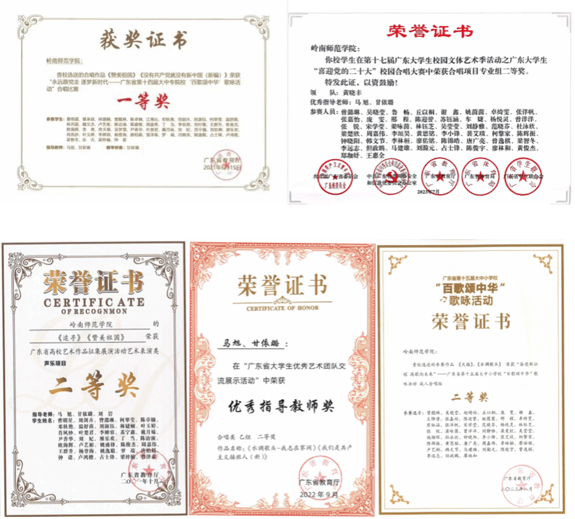 学院合唱团在2021广东省第十四届大中专院校“百歌颂中华”歌咏活动中荣获合唱比赛一等奖,在2021广东省高校艺术作品展演活动、2022广东省大学生优秀艺术团队交流展示活动、2023第十七届广东大学生校园文体艺术季活动之广东大学生喜迎党的二十大”校园合唱大赛和2023广东省第十五届大中小学校百歌颂中华歌咏活动中分别获得二等奖。