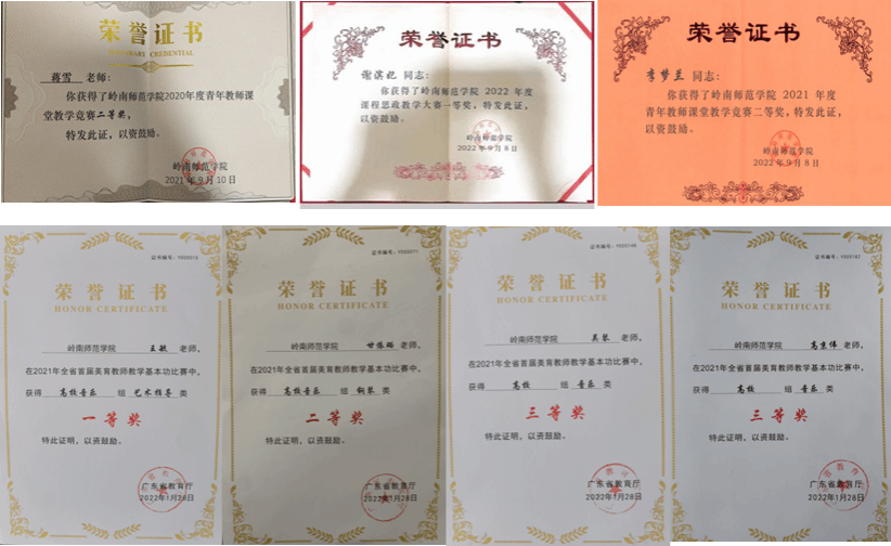 表彰获奖:刘福瑞教授的《跟我学唱歌》推介到国家高等教育智慧教育平台;谢滨妃、王毓、甘依璐等老师在校青教赛、思政教学大赛和省美育教师教学基本功比赛中获奖达10余项。