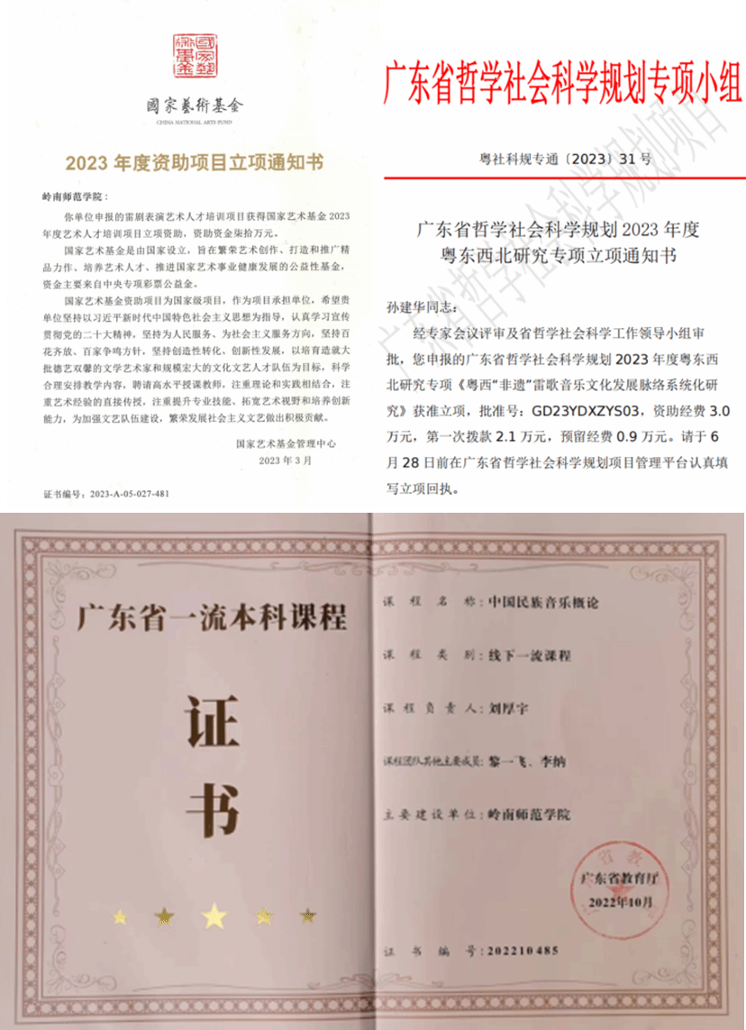 项目立项:近三年来,我院获得市级以上科研项目立项16项,质量工程项目6项,国家艺术基金项目1项,教育部人文项目1项,省级项目5项、市级项目10项;获知识产权8项,刘厚宇教授的《中国民族音乐概论》获批省级一流课程。