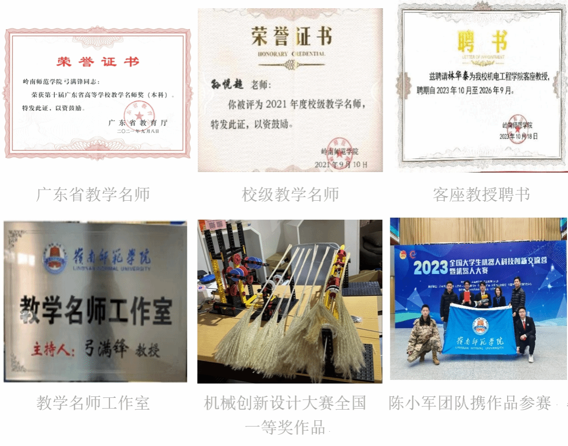 学院聚焦人才培养需要,持续加大优秀教师引进培育力度。专任教师具有正高级职称7人,副高级职称19人,高级职称所占比例50%,其中博士34人,比例为65%。“双师双能”型教师50名,双聘院士1名,聘请1名美籍华人为客座教授,博士工作站外聘兼职博士11名。2019年,弓满锋教授获得岭南师范学院教学名师称号,同年成立教学名师工作室。2021年5月,孙悦超教授获岭南师范学院教学名师。2021年9月,弓满锋教授获得广东省教学名师,成为了我院首位获得该荣誉的教师,学院教师专业水平明显提高。2022年6月,连海山副教授、弓满锋教授指导学生参加第十届全国大学生机械创新设计大赛,荣获全国决赛一等奖,实现了全国一等奖零的突破。2023年12月,陈小军副教授指导学生斩获2023年全国大学生机器人科技创新交流营暨机器人大赛全国二等奖,取得学校在该项赛事上的最好成绩。