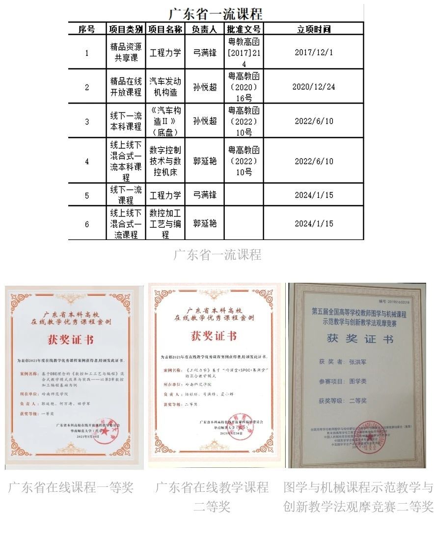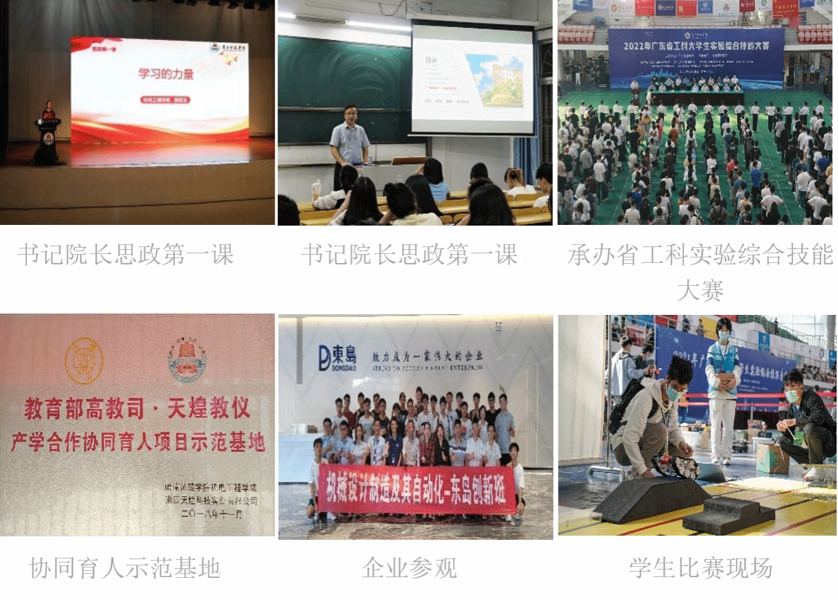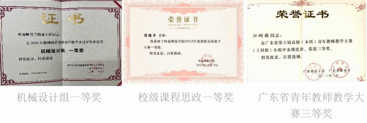 学院积极组织教师参加各级教学比赛,并取得了较好成绩。参加学校2021年度青年教师课堂教学竞赛,获得副高组二等奖1项、三等奖2项;1名教师获广东高校学生工作优秀案例省三等奖;1名教师获校级课程思政一等奖,2名教师获校级“课程思政”优秀教师;2名教师分别获第六届广东省高校青年教师教学大赛二等奖和三等奖;1名教师在2022年机械设计基础课程教学设计评比中获机械设计组一等奖。2023年度,获省级教学改革项目3项,校级教学改革研究项目6项,省级质量工程5项,校级质量工程项目4项。2024年,获批广东省现代产业学院“智能制造产业学院”和广东省“高端数字化制造人才培养校企联合实验室”。