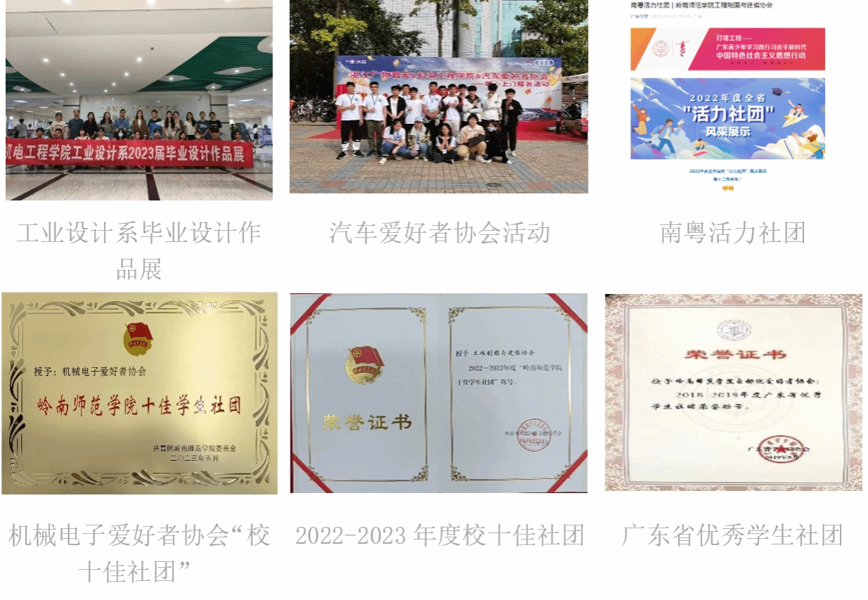 学院主动适应国家战略发展新需求和当前高等教育发展新趋势,围绕学校中心工作,以“新工科”建设为引领,以学科竞赛和创新创业比赛为突破口,在创新创业教育方面成效显著。学院共有5个专业社团,包括:工业制图与建模协会、工业设计协会、自动化爱好者协会、汽车爱好者协会、机械电子爱好者协会。其中,自动化爱好者协会获评“广东省优秀学生社团”称号;工程制图与建模协会获评广东省“南粤活力社团”,以及获评2021-2022、2022-2023年度校级十佳社团;机械电子爱好者协会获评“湛江市优秀学生社团”、2021-2022年度校级十佳社团称号。工业设计专业定期在学校图书馆组织学生毕业设计作品展,学以致用,提升创新实践能力。