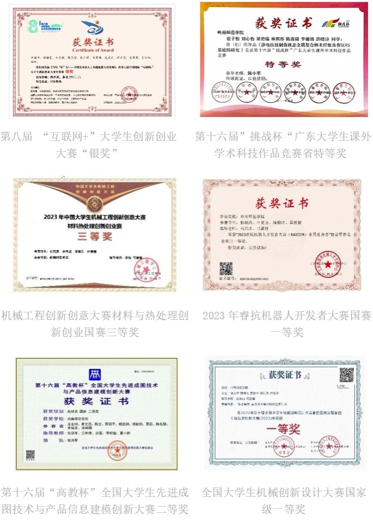 近三年,学生获批校级及其以上“大学生创新创业训练计划项目”9项,其中国家级项目3项,省级项目6项,参加各级各类创新创业实践活动人数近1000人,占学生总数的55.6%;获省级及以上“互联网+”大学生创新创业大赛获奖数1项。多次在全国高教杯全国大学生先进成图技术与产品信息建模创新大赛、“挑战杯”大学生课外学术科技作品竞赛、全国大学生机械创新设计大赛、广东省工科大学生实验综合技能竞赛,省级以上学科竞赛获奖100余项,省级以上学科竞赛获奖学生总数200人左右,占学生总数20%。在此基础上,学生发明专利和实用新型专利共授权27件。