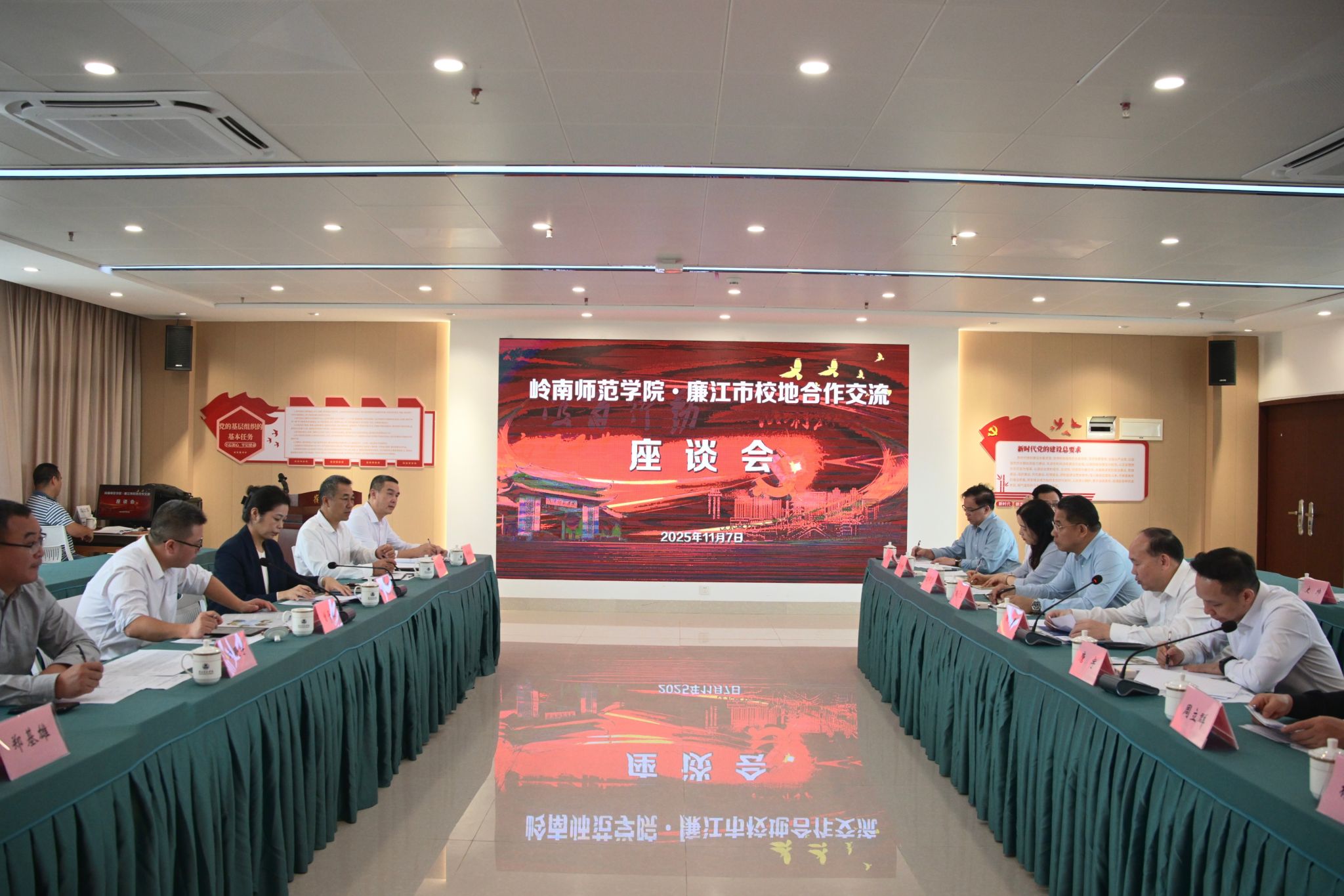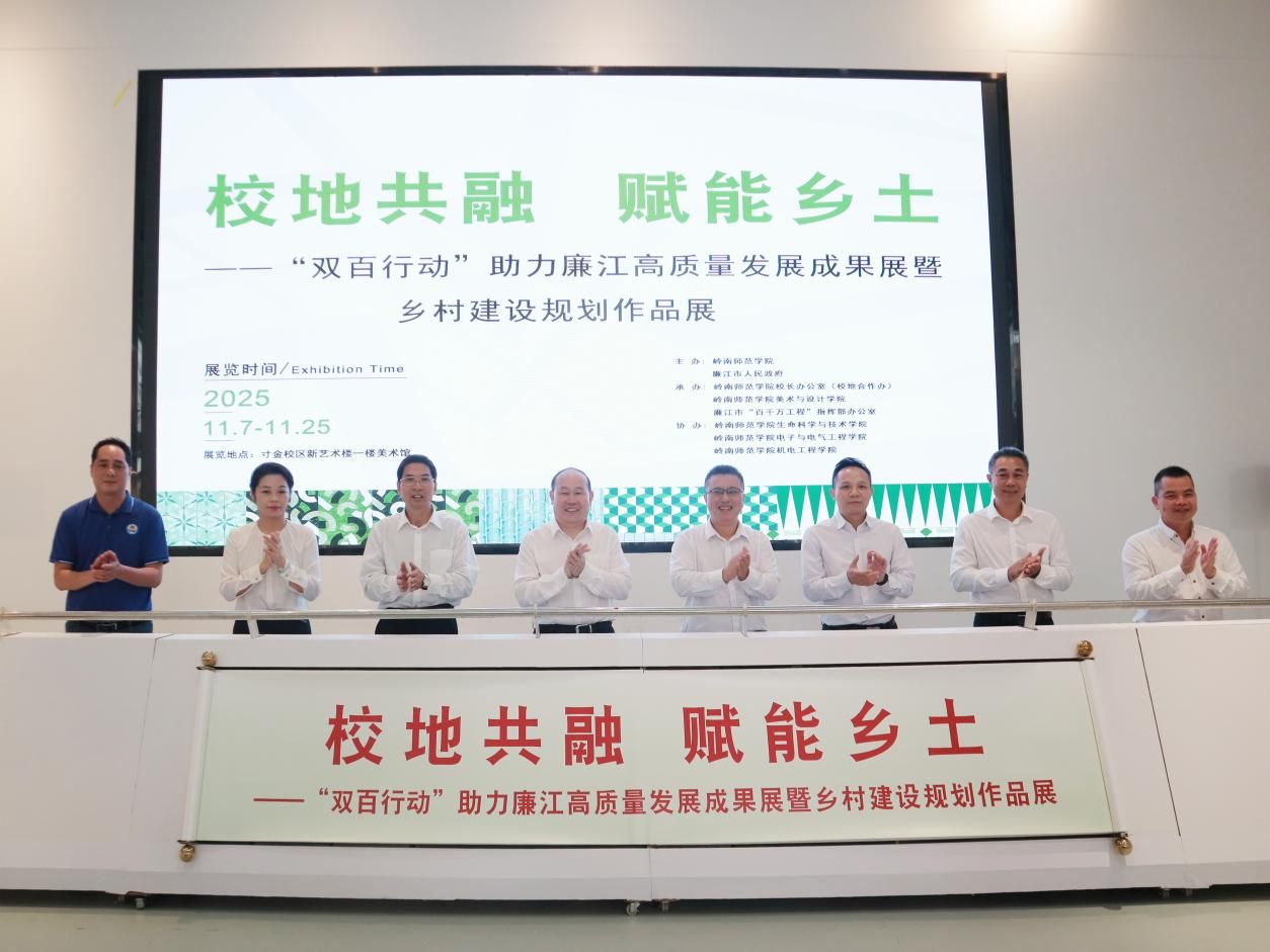 11月7日上午,廉江市委书记曾平治、副市长韩阳一行莅临岭南师范学院调研交流,与学校校长阳爱民、党委副书记林晓敏、副校长唐宇共同为“校地共融 赋能乡土——‘双百行动’助力廉江高质量发展成果展暨乡村建设规划作品展”揭幕。双方围绕深化“双百行动”实施、拓展校地合作领域展开座谈,共绘校地协同发展新蓝图。