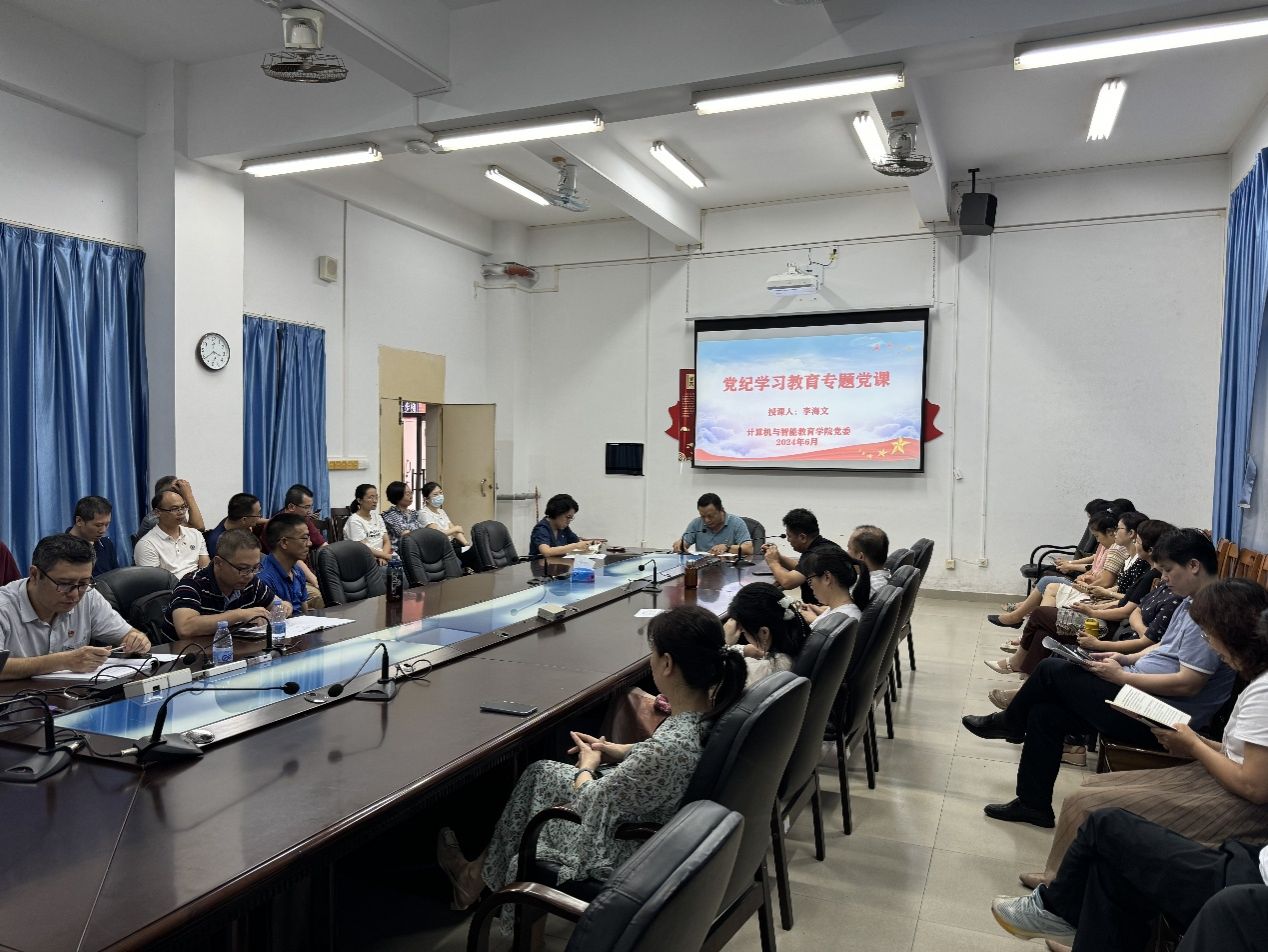 为深入贯彻党中央关于开展党纪学习教育的决策部署,6月12日,计算机与智能教育学院党委书记李海文在综B101会议室为学院全体教职工党员上了一堂生动的党纪学习教育专题党课。本次党课以新修订的《中国共产党纪律处分条例》为指导,结合《新时代高校教师职业行为十项准则》,对全体党员进行了一次深刻的党性教育和纪律教育。