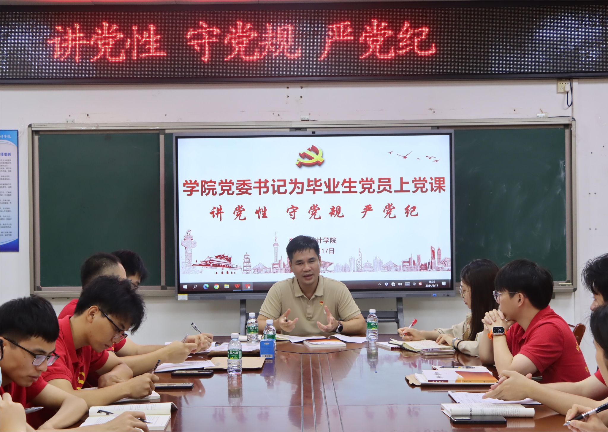 5月17日下午,数计学院于榕燕楼会议室举行了一场以“讲党性,守党规,严党纪”为主题的专题党课。学院党委书记叶建仔为毕业生党员讲授党课,辅导员张嫣、全体毕业生党员参加了本次活动。