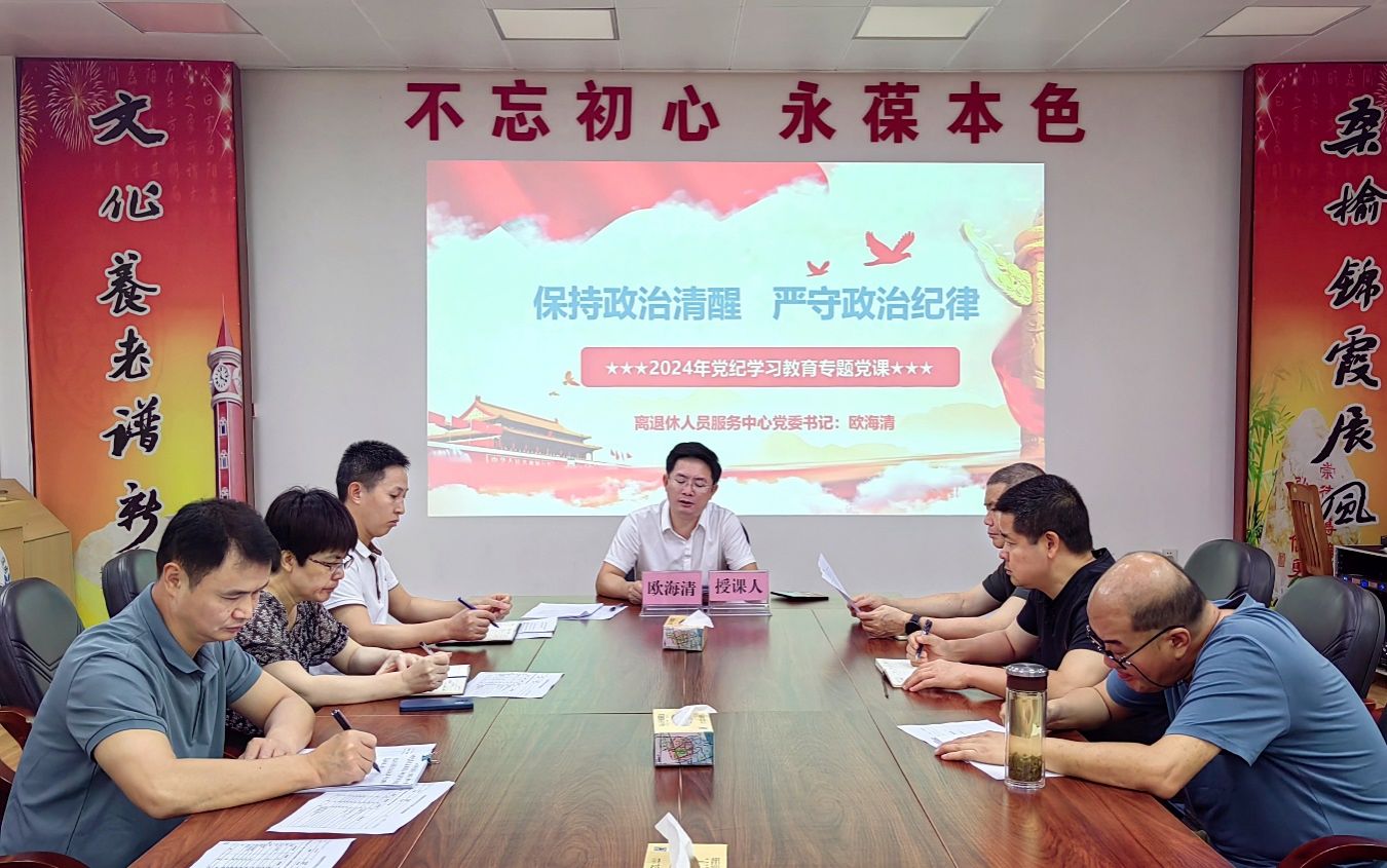 为认真落实学校党纪学习教育部署要求,切实强化党员干部党纪观念和自我约束意识,5月17日上午,离退休人员服务中心党委书记欧海清以《保持政治清醒 严守政治纪律》为题,为离退休人员服务中心全体在职党员干部讲授党纪教育专题党课。