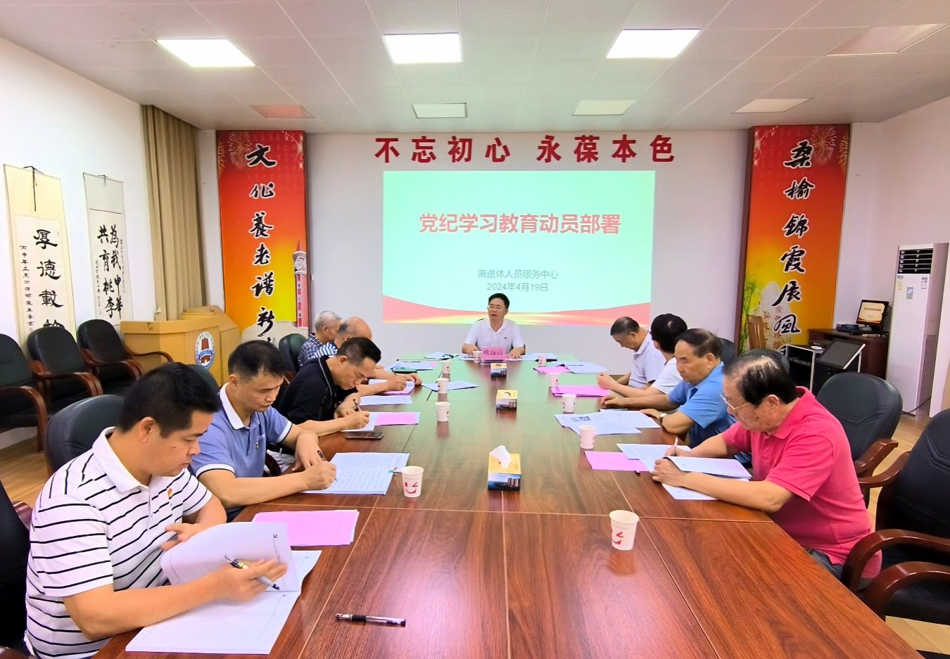 4月19日下午,离退休人员服务中心党委召开党纪学习教育动员部署会,专题传达学习中共中央办公厅《关于在全党开展党纪学习教育的通知》和学校党纪学习教育启动部署会及工作方案精神。离退休人员服务中心党委书记、主任欧海清主持会议并作动员部署讲话。党委委员和部分党支部书记代表参加会议。