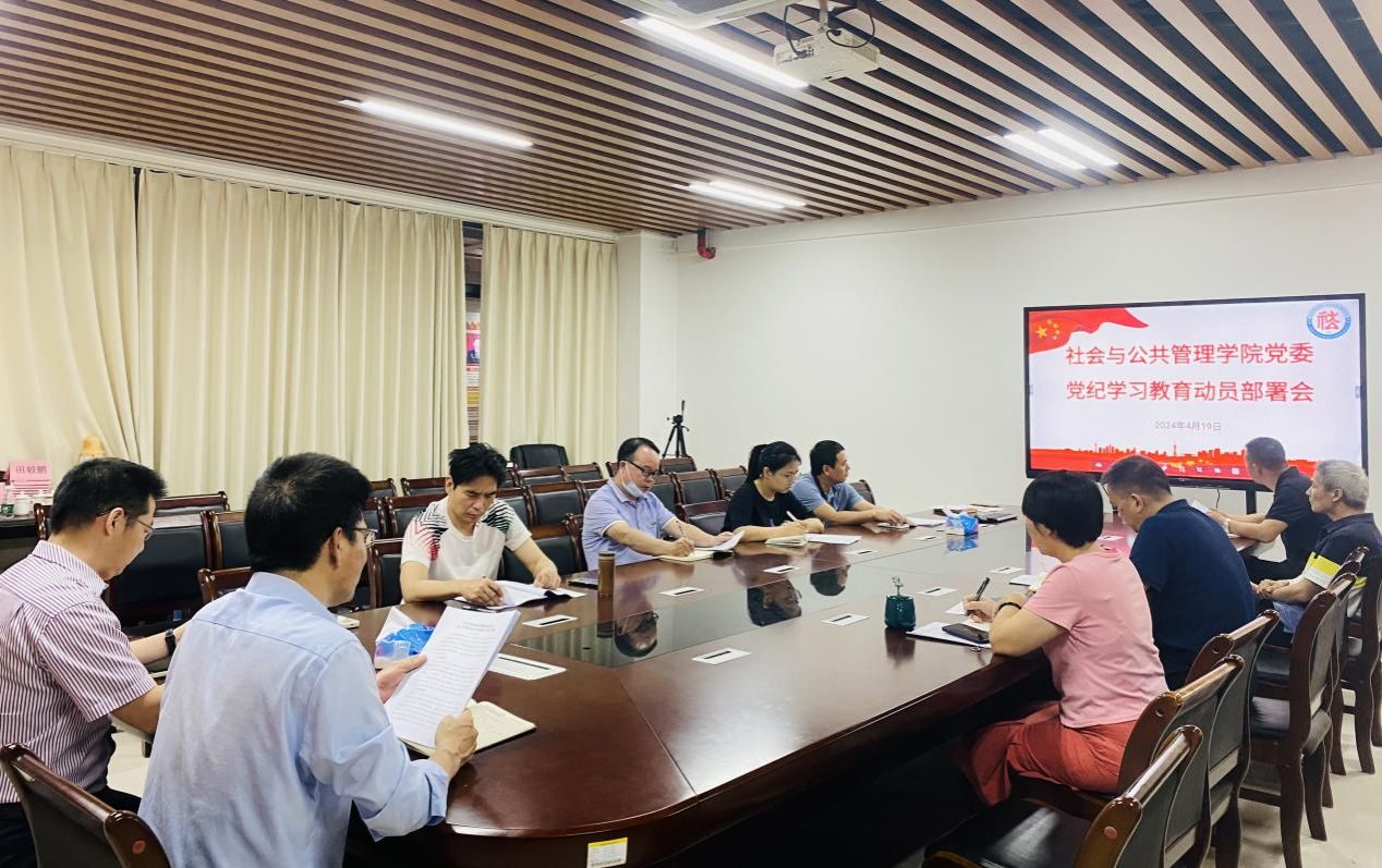 4月19日下午,社会与公共管理学院党委在教五D303-2室召开党纪学习教育动员部署会。学院党委书记冯亮如主持会议,学院领导班子成员和各党支部书记参加会议。