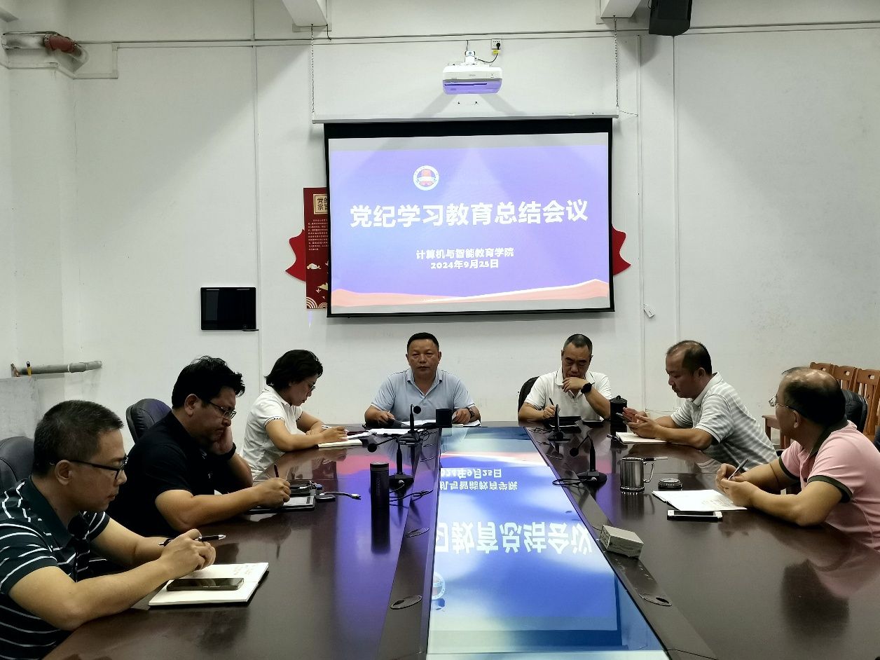 9月25日下午,计算机与智能教育学院党委召开党纪学习教育总结会议,传达学习习近平总书记关于党纪学习教育的重要指示精神、学校党委党纪学习教育总结会议精神,并部署下一步工作。学院党委书记李海文作总结报告,学院全体班子成员以及各党支部书记参加了会议。